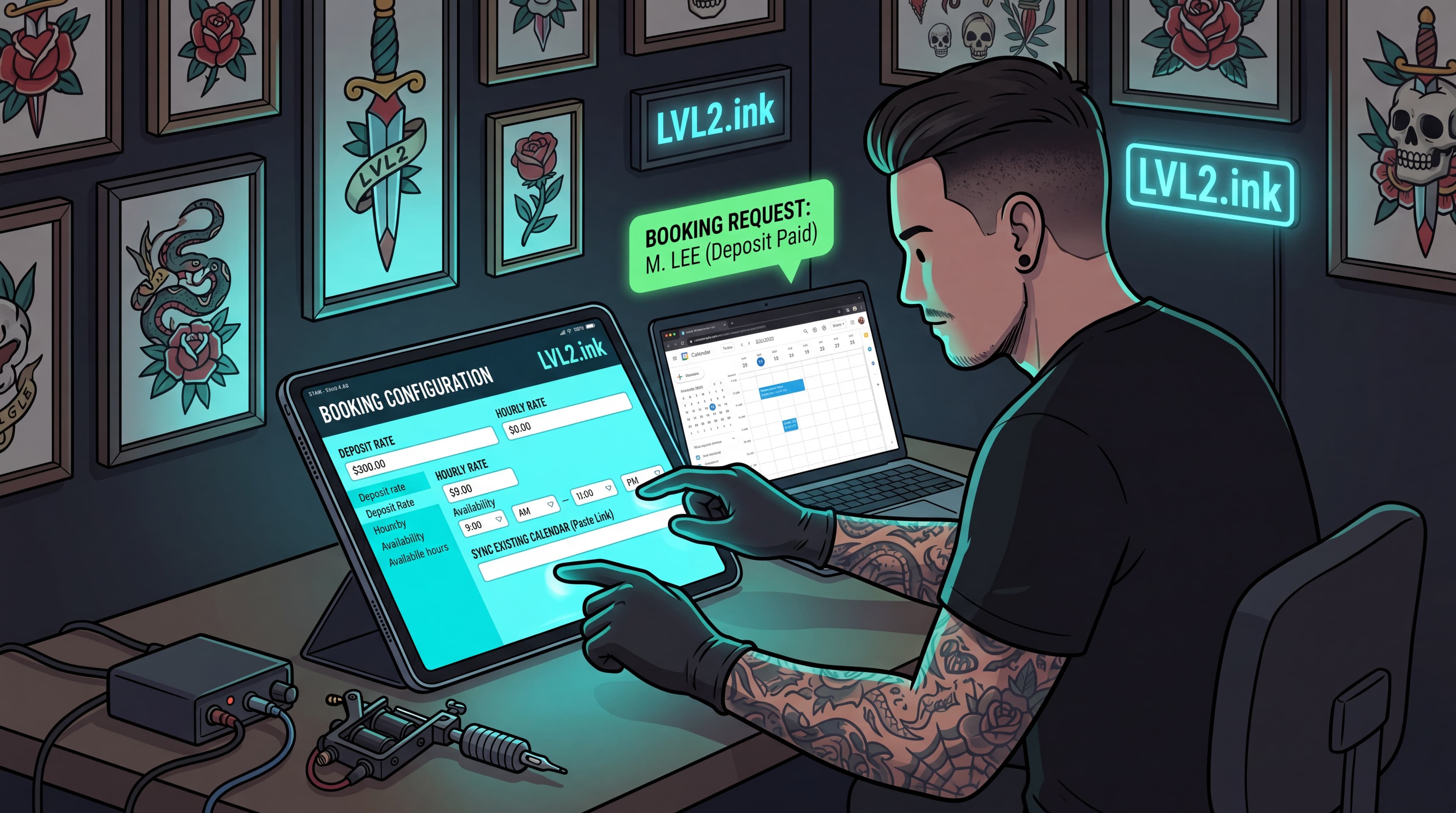 For the independent artist renting a chair. Everything you need to run bookings, flash, shop setup, and client records.